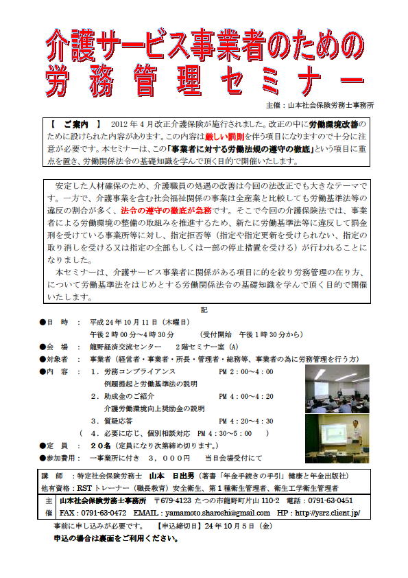 加古川,姫路,社会保険労務士,山本社会保険労務士事務所昨日、H24/10/11に山本社会保険労務士事務所主催「介護サービス事業者向け労務管理セミナー」を