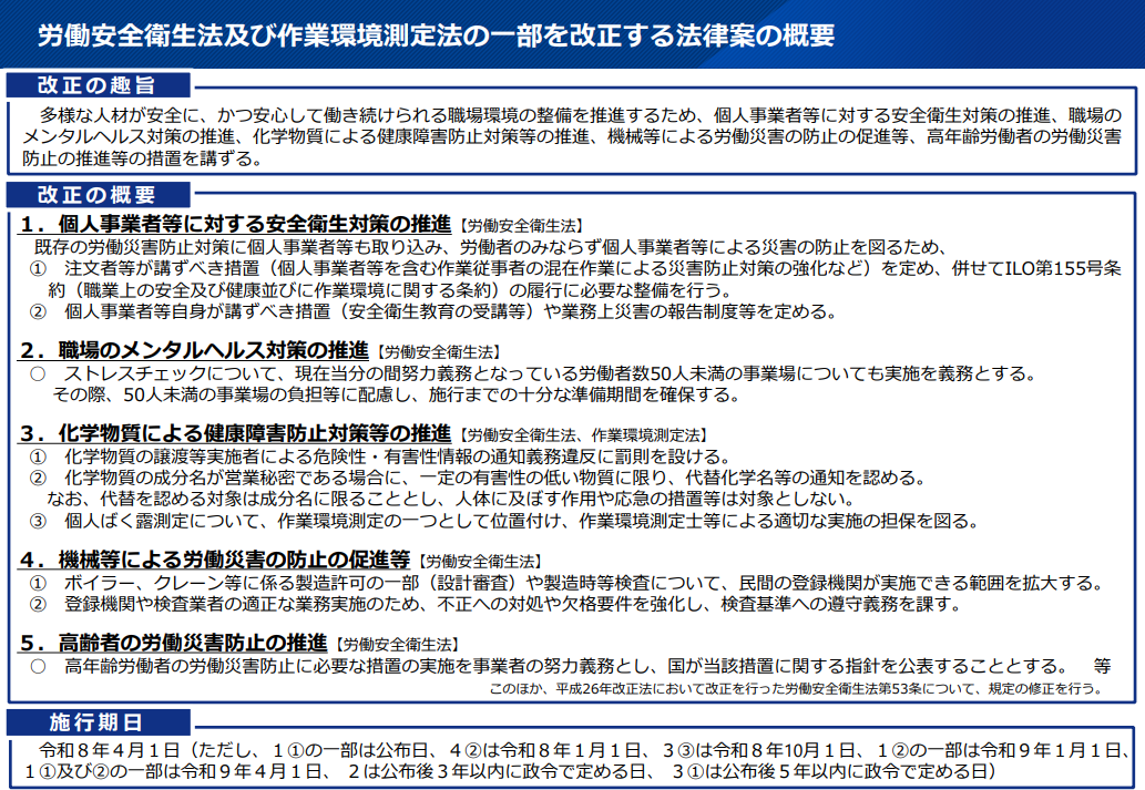 ■改正の概要1.個人事業者等に対する安全衛生対策の推進既存の労働災害防止対策に個人事業者等も取り込み、労働者のみならず個人事業者等による災害の防止を図るため、① 注文者等が講ずべき措置(個人事業者等を含む作業従事者の混在作業による災害防止対策の強化など)を定め、併せてILO第155号条 約(職業上の安全及び健康並びに作業環境に関する条約)の履行に必要な整備を行う。② 個人事業者等自身が講ずべき措置(安全衛生教育の受講等)や業務上災害の報告制度等を定める。2.職場のメンタルヘルス対策の推進ストレスチェックについて、現在当分の間努力義務となっている労働者数50人未満の事業場についても実施を義務とする。 その際、50人未満の事業場の負担等に配慮し、施行までの十分な準備期間を確保する。3.化学物質による健康障害防止対策等の推進① 化学物質の譲渡等実施者による危険性・有害性情報の通知義務違反に罰則を設ける。② 化学物質の成分名が営業秘密である場合に、一定の有害性の低い物質に限り、代替化学名等の通知を認める。 なお、代替を認める対象は成分名に限ることとし、人体に及ぼす作用や応急の措置等は対象としない。③ 個人ばく露測定について、作業環境測定の一つとして位置付け、作業環境測定士等による適切な実施の担保を図る。4.機械等による労働災害の防止の促進等① ボイラー、クレーン等に係る製造許可の一部(設計審査)や製造時等検査について、民間の登録機関が実施できる範囲を拡大する。 ② 登録機関や検査業者の適正な業務実施のため、不正への対処や欠格要件を強化し、検査基準への遵守義務を課す。5.高齢者の労働災害防止の推進高年齢労働者の労働災害防止に必要な措置の実施を事業者の努力義務とし、国が当該措置に関する指針を公表することとする。 等