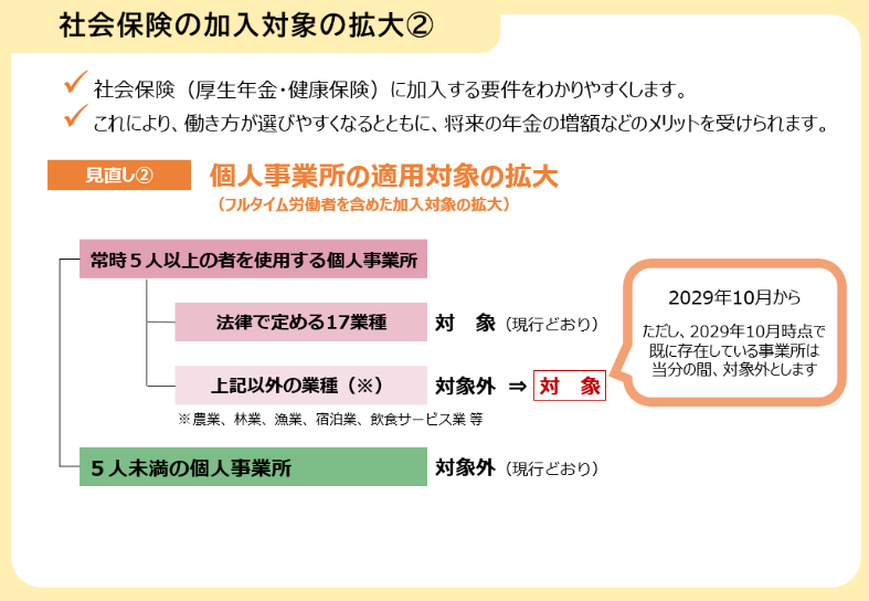 現在、社会保険の強制加入対象事業所として、法人や個人事業で常時5人以上の法律で定める業種に該当するところが対象です。今回の改正では、個人事業で常時5人以上の法律で定める業種に該当しなかった事業所(農業、林業、漁業、飲食サービスなど)が強制加入の事業所として拡大されます。いままでは非該当の業種は常時5人以上でも任意でしたが、この改正により個人事業でも常時5人以上の事業所は業種に関わらず社会保険の強制適用事業所になります。2029年10月からですが、2029年10月時点で既に存在している事業所は任意のままとなります。