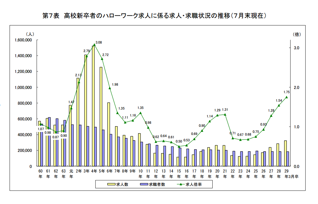 加古川,姫路,社会保険労務士,山本社会保険労務士事務所厚生労働省は、先日、平成29年3月に高校や中学を卒業する生徒について、平成28年7月末現在の公共職業安定所(ハローワーク)求人における求人・求職状況を取りまとめました。その結果は以下のとおりとなっています。【高校新卒者】求人数 約324,000人で、前年同期比13.3%の増求職者数 約 185,000人で、同0.6%の減求人倍率 1.75倍で、同0.21ポイントの増【中学新卒者】求人数 920人で、前年同期比18.3%の増求職者数 1,006人で、同5.7%の減※厚生労働省HPより抜粋このように高卒・中卒共に求人数が大幅に増加しています。グラフは高卒の求人・求職状況の推移をまとめたものですが、6年連続増加し、リーマンショック前の水準は軽く超えています。企業の採用のターゲットが高卒にも伸びてきており、今後は高卒でも 厳しい採用競争が繰り広げられることが予想されます。