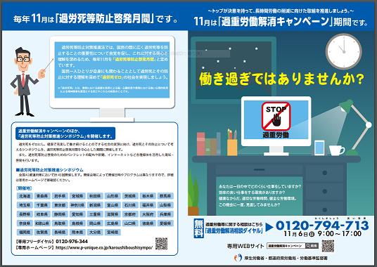 その一環として「過重労働解消キャンペーン」を実施し、長時間労働の削減等の過重労働解に向けた取組を推進する為に、使用団体、労働組合への協力要請、リーフレットの配布などにより周知・啓発等の取組を集中的に実施!