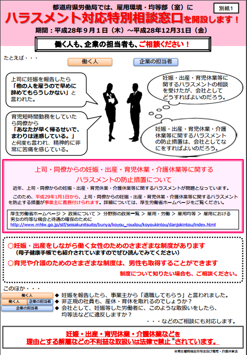 加古川,姫路,社会保険労務士,山本社会保険労務士事務所平成29年1月1日から、改正男女雇用機会均等法と改正育児・介護休業法が全面施行されますが、これに併せて平成28年9月1日から平成28年12月31日まで「全国マタハラ未然防止対策キャラバン」が実施されることになりました。