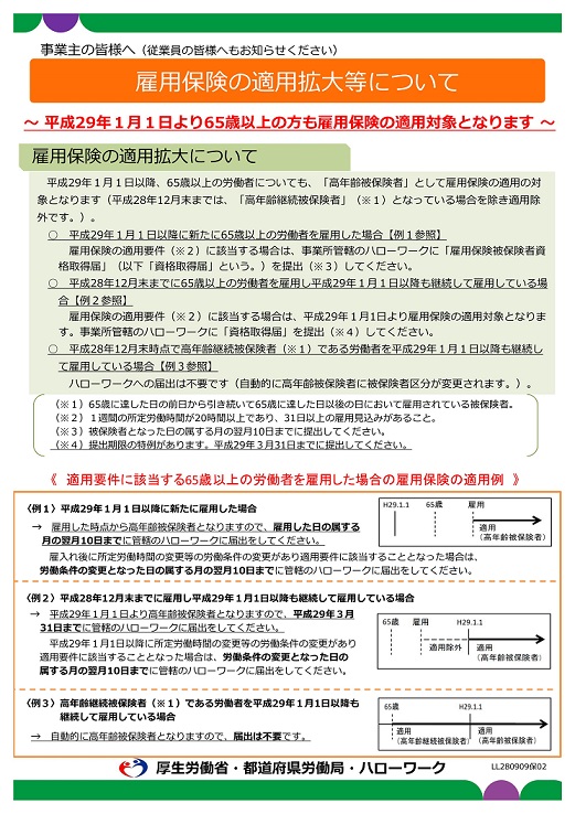 平成29年1月1日以降、65歳以上の労働者についても、「高年齢被保険者」として雇用保険の適用の対象になります。