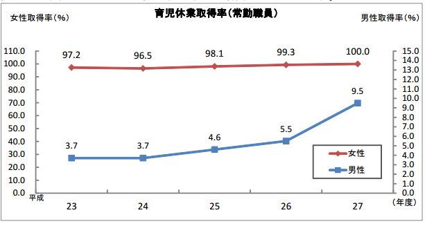 加古川,姫路,社会保険労務士,山本社会保険労務士事務所いわゆるイクメンが注目を浴びており、男性でも育児休業を取得し、積極的に子育てに参加するケースが増えてきています。厚生労働省の「平成27年度雇用均等基本調査」によれば、男性の育児休業取得率は2.65%と過去最高を記録していますが、国家公務員においては、実に、男性の9.5%が育児休業を取得したと人事院が発表しました。この取得率は前年比では172%の大幅な伸びとなっています(前年5.5%)下のグラフはその推移となっていますが、男性の取得率がここに来て、急速に高まっていることが分かります。また日本生産性本部の「2015年度 新入社員 秋の意識調査」)によれば、男性新入社員の実に73.6%が育児休業の取得意向ありと回答しており、ここに来て、男性の意識が大きく変わってきたことが分かります。