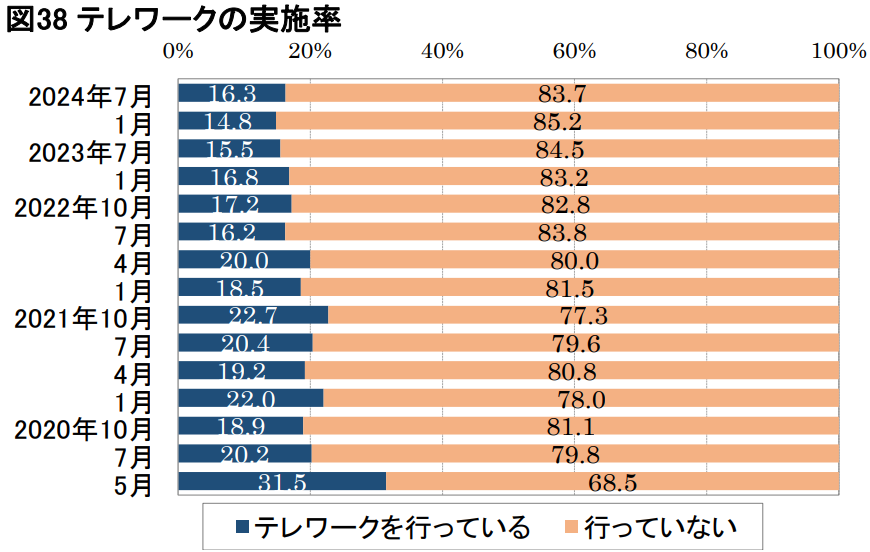 加古川,姫路,社会保険労務士,山本社会保険労務士事務所調査研究や提言、実践活動により生産性向上をめざす公益財団法人日本生産性本部が、新型コロナウイルス感染症が組織で働く人の意識に及ぼす影響の継続調査(第15回「働く人の意識調査」)結果を取りまとめ、公表しました。この調査は、組織で働く雇用者を対象に、勤め先への信頼度や雇用・働き方に対する考え方などについて、2020年5月以降、四半期毎(2023年7月調査より6か月に一回へ変更)にアンケートで実施しているもので、20歳以上の日本の企業・団体に雇用されている者(雇用者=就業者から自営業者、家族従業者等を除いたもの)1,100名を対象にインターネットを通じて行いました。【テレワーク実施率増加、大企業実施率は低下】新型コロナウイルス感染症の感染防止対策をきっかけのひとつとして、時差出勤やテレワークの積極的な活用が推奨されてきました。2023年5月の「5類」への変更以降、働き方には変化が生じています。テレワークの実施率は過去最低であった前回調査の14.8%から微増し、16.3%。2023年1月調査から減少が続いていましたが、増加に転じています。(図38)