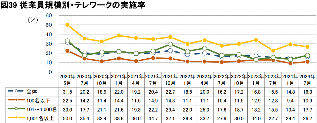 これまでテレワークの実施率は、大企業および中規模企業がけん引してきましたが、前回調査にて増加した大企業は今回わずかに低下したものの、中規模企業、小規模企業の実施率が増加したことで、全体のテレワーク実施率が16.3%となっています。(図39)