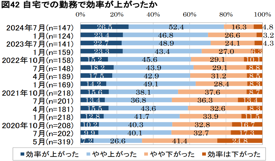 テレワークの大多数を占める自宅での勤務について、効率の向上を質問したところ、「効率が上がった」「やや上がった」の合計は、前回の70.2%から78.9%へと増加し、過去最高となっています。また、自宅での勤務の満足度について「満足している」「どちらかと言えば満足している」の合計は、前回の86.3%から87.1%に微増しました。(図42)
