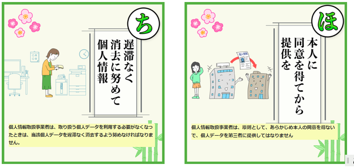 (1) アクセス制御・個人データを取り扱うことのできる機器及び当該機器を取り扱う従業者を明確化し、個人データへの不要なアクセスを防止する。(2) アクセス者の識別と認証・機器に標準装備されているユーザー制御機能(ユーザーアカウント制御)により、個人情報データベース等を取り扱う情報システムを使用する従業者を識別・認証する。(3) 外部からの不正アクセス等の防止・個人データを取り扱う機器等のオペレーティングシステムを最新の状態に保持する。・個人データを取り扱う機器等にセキュリティ対策ソフトウェア等を導入し、自動更新機能等の活用により、これを最新状態とする。(4) 情報システムの使用に伴う漏えい等の防止・メール等により個人データの含まれるファイルを送信する場合に、当該ファイルへのパスワードを設定する。【物理的安全管理措置】個人情報取扱事業者は、物理的安全管理措置として、次に掲げる措置を講じなければならない。(1) 個人データを取り扱う区域の管理・個人データを取り扱うことのできる従業者及び本人以外が容易に個人データを閲覧等できないような措置を講ずる。(2) 機器及び電子媒体等の盗難等の防止・個人データを取り扱う機器、個人データが記録された電子媒体又は個人データが記載された書類等を、施錠できるキャビネット・書庫等に保管する。・個人データを取り扱う情報システムが機器のみで運用されている場合は、当該機器をセキュリティワイヤー等により固定する。(3) 電子媒体等を持ち運ぶ場合の漏えい等の防止・個人データが記録された電子媒体又は個人データが記載された書類等を持ち運ぶ場合、パスワードの設定、封筒に封入し鞄に入れて搬送する等、紛失・盗難等を防ぐための安全な方策を講ずる。(4) 個人データの削除及び機器、電子媒体等の廃棄・個人データを削除し、又は、個人データが記録された機器、電子媒体等を廃棄したことを、責任ある立場の者が確認する。ホームページには、上記内容に関するリーフレットなどの案内も掲載されていますので、対策が不十分と思われる場合には、この機会に対策を再確認してみてはいかがでしょうか。個人情報保護委員会HP「個人情報を考える週間」https://www.ppc.go.jp/news/privacy_awareness_week/ -