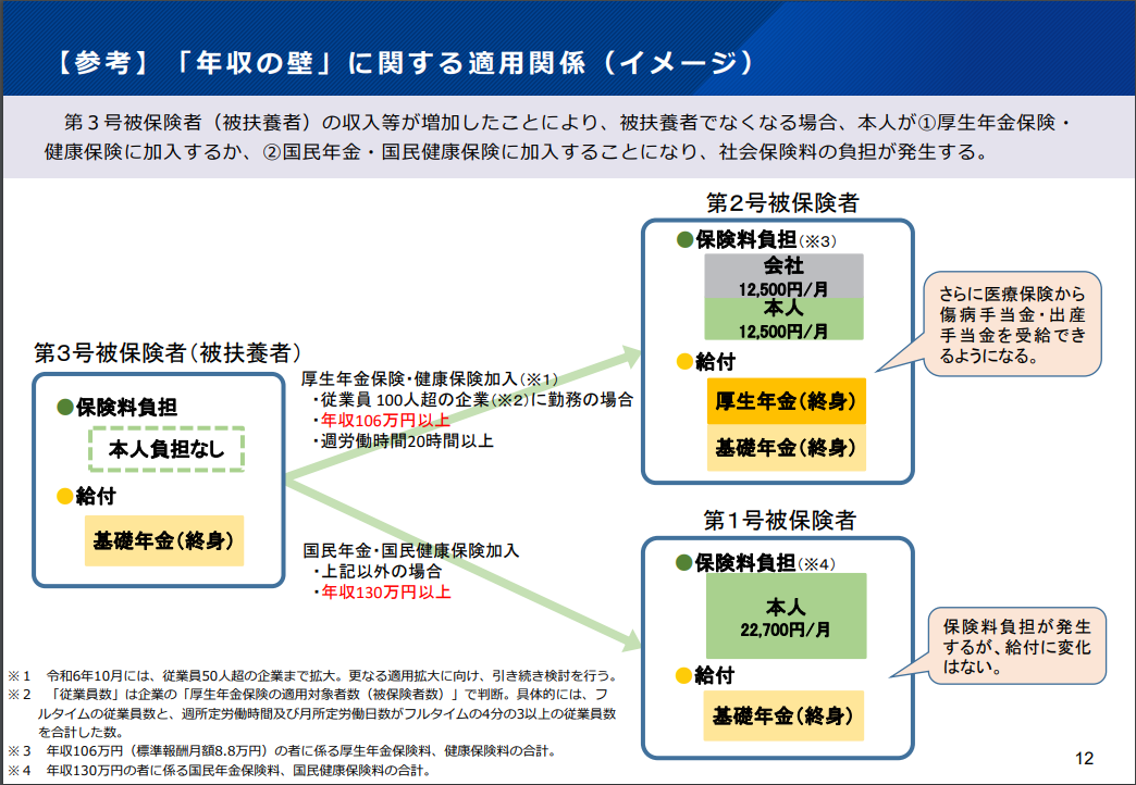 【「年収の壁」とは】厚生年金保険及び健康保険において、会社員の配偶者等で一定の収入がない方は、被扶養者(第3号被保険者)として、社会保険料の負担が発生しません。こうした方の収入が増加して一定の収入を超えると、社会保険料の負担が発生し、その分手取り収入が減少するため、これを回避する目的で就業調整する方がいます。その収入基準(年収換算106 万円や 130 万円)がいわゆる「年収の壁」と呼ばれています。・従業員100人超の企業に勤務する場合:106万円※「従業員100人超企業に週20時間以上で勤務する場合」は、所定内賃金が月額8.8万円以上(年収約106万円)になると厚生年金保険等に加入。・従業員100人以下の企業に勤務する場合:130万円※「従業員100人以下の企業に勤務する場合」は、所定労働時間および所定労働日がフルタイムの4分の3以上になると厚生年金保険等に加入、所定労働時間および所定労働日が4分の3未満で年収130万円以上の場合は国民年金・国民健康保険に加入。※「従業員100人超」は令和6年10月以降は50人超になります。 -
